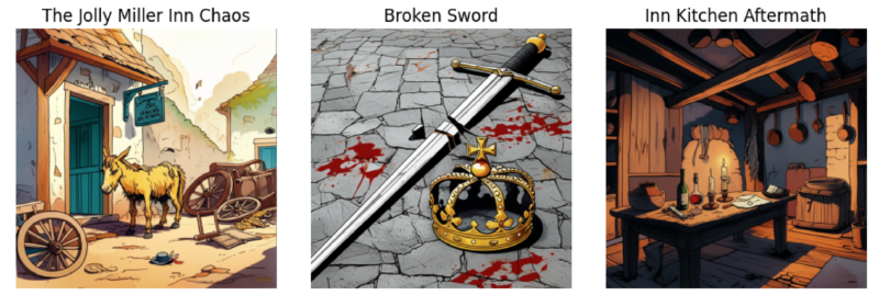 - “The Jolly Miller Inn Chaos”: Exterior scene with a yellow pony, scattered debris, and dramatic lighting hinting at recent altercation