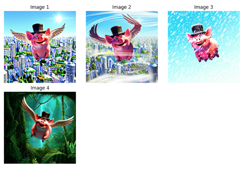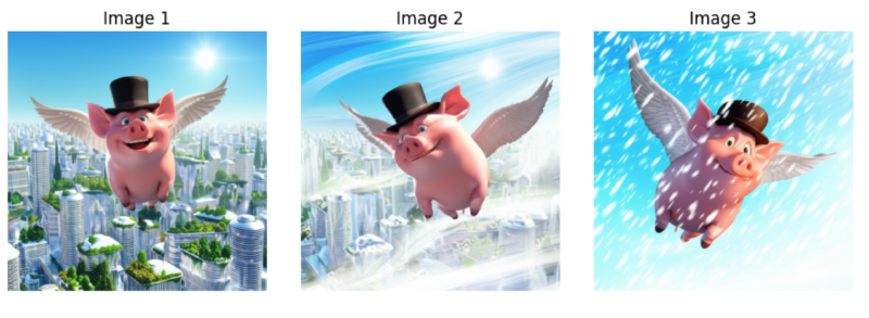 Consider this simple experiment: generating three images of “the same pig with wings and a top hat flying over a futuristic city” in different weather conditions. Even with identical prompts and seeds, subtle inconsistencies emerge—eye colors change, proportions shift, and the overall character can feel different.