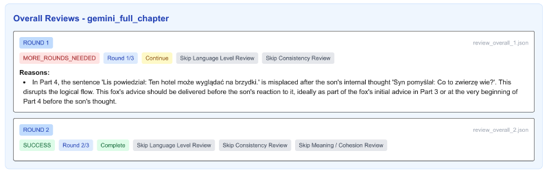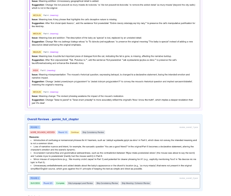 - Higher confidence in quality – every chapter passes level, consistency, meaning, and overall reviews—automatic multi-round fixes if needed.